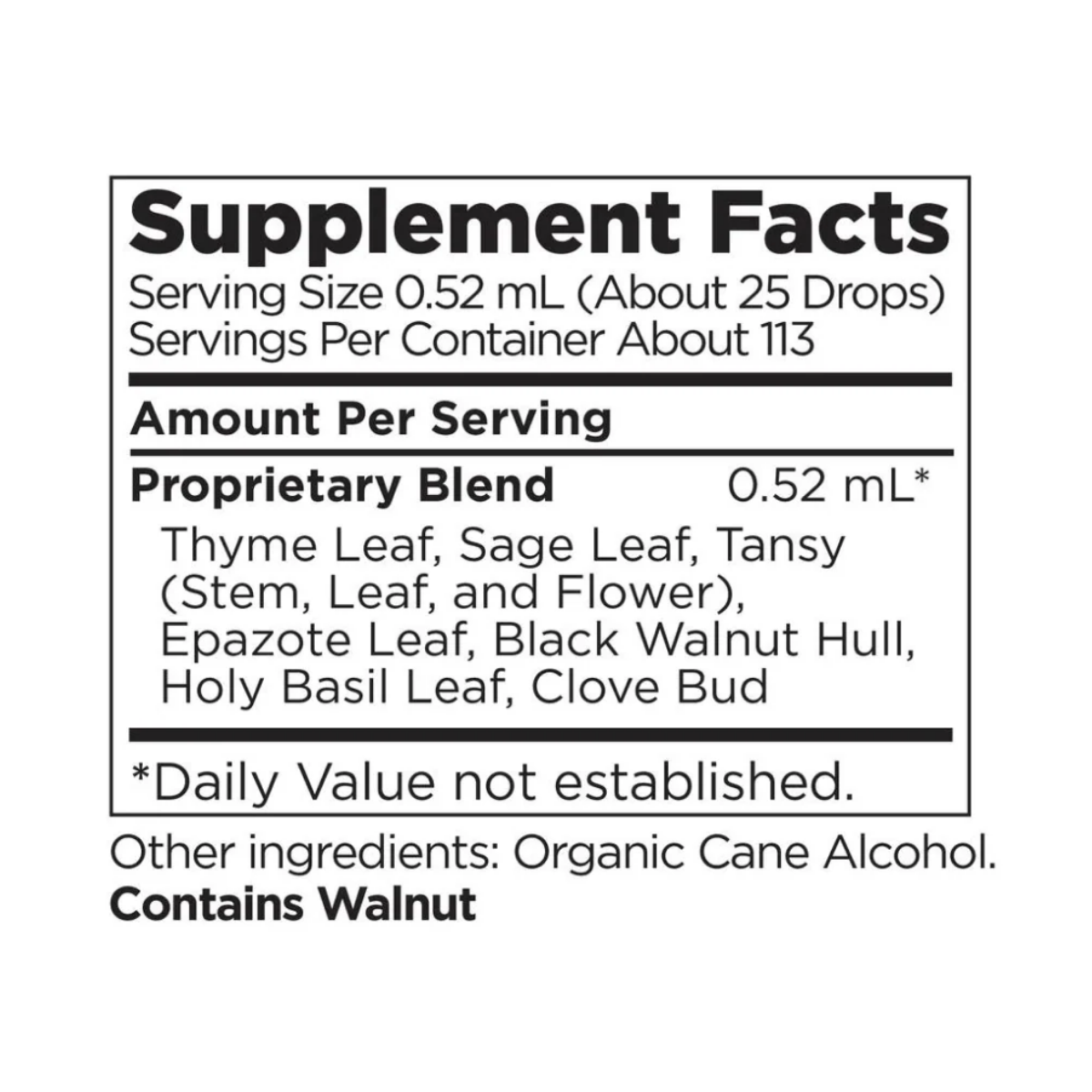 A blend of seven herbs — including clove, black walnut hull, and holy basil — works together to support the body’s natural detoxification processes and gut microbiome.*
